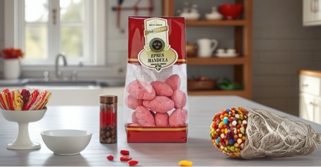 Eperporos (2,25%)%), fehércsokoládés (77,75%) mandula (20%).